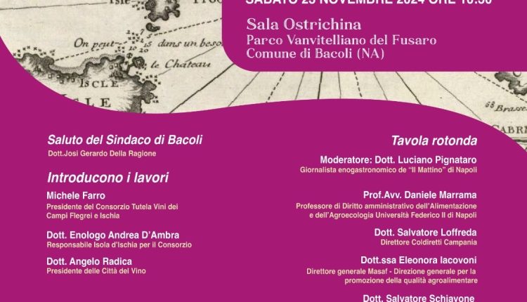 Il Consorzio di Tutela dei Vini dei Campi Flegrei e Ischia presenta il convegno per il trentennale del riconoscimento della Dop per i vini dei Campi Flegrei “Dalla viticoltura eroica alla città del vino” è il tema dell’incontro che si terrà sabato 23 novembre, a partire dalle 10:30, nella Sala Ostrichina del Parco Vanvitelliano del Fusaro a Bacoli (Napoli).