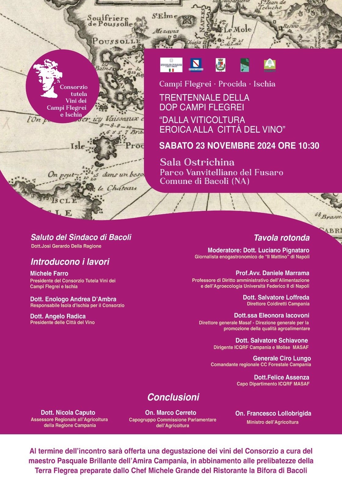 Dopo i saluti del sindaco di Bacoli, Josi Gerardo Della Ragione, introdurranno i lavori Michele Farro, Andrea D’Ambra, enologo responsabile isola D’Ischia per il Consorzio, e Angelo Radica, presidente Città del Vino. Partecipano alla tavola rotonda il prof. Daniele Marrama, Salvatore Loffreda, direttore di Coldiretti Campania, Eleonora Iacovoni, direttore generale Masaf – Direzione generale per la promozione della qualità agroalimentare, Salvatore Schiavone, dirigente ICQRF Campania e Molise MASAF, Ciro Lungo, Generale Comandante regionale CC Forestale Campania, Felice Assenza, Capo Dipartimento ICQRF MASAF. Modera Luciano Pignataro, giornalista enogastronomico del Mattino. Le conclusioni sono affidate a Nicola Caputo, assessore regionale all’Agricoltura, all’on. Marco Cerreto, capogruppo Commissione Parlamentare Agricoltura e a Francesco Lollobrigida, Ministro dell’Agricoltura.