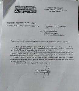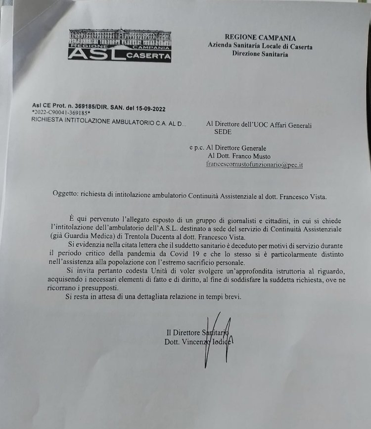 Trentola Ducenta– Continua spedito l’iter procedurale,per dedicare la guardia medica di Trentola Ducenta al medico Franco Vista ,da tutti conosciuto come il medico di tutti. Non si contano pazienti e semplici concittadini che quotidianamente aspettavano il Dr Franco Vista ,ancora prima del suo turno, negli uffici della guardia medica, ubicata in via Bovaro a Trentola Ducenta. Proprio il contatto diretto con tanta gente ha favorito l’infezione da Covid 19 ,che ne ha fatto una delle prime vittime. Alla notizia della dipartita del Dr Vista tanta gente, spontaneamente e con le dovute misure di sicurezza, sostò in preghiera nell’area adiacente i locali della guardia medica cittadina,dove il vuoto lasciato dal dottore ancora risuona. Tanti i giornalisti del casertano che hanno voluto segnalare alle autorità competenti la volontà di dedicargli la struttura della guardia medica. Si ringrazia il Dirigente Medico Enzo Iodice,che ha immediatamente messo in atto ogni iniziativa per ricordare, con tanto di lastra, il dott FRANCO VISTA, medico, vittima del dovere.