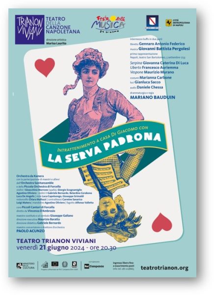 Il Trianon Viviani partecipa alla Festa della Musica, il 21 giugno prossimo, alle 20:30, con una nuova produzione: “La Serva padrona”, il capolavoro di Giovanni Battista Pergolesi su libretto di Gennaro Antonio Federico.