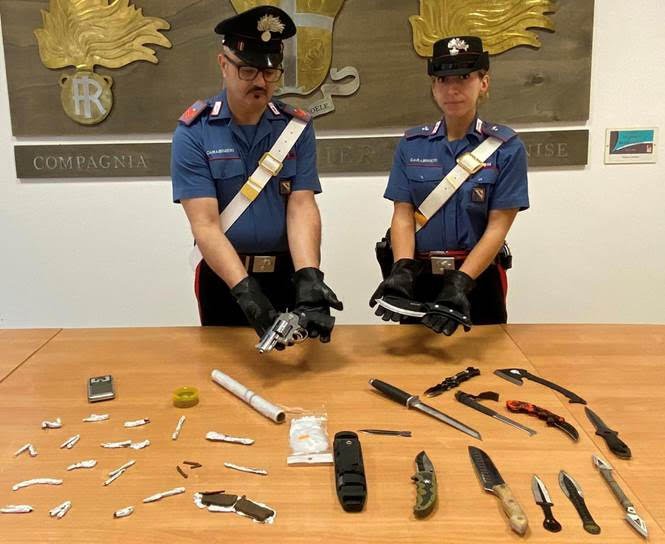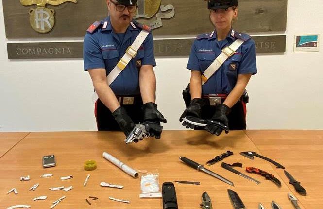 Le successive perquisizioni domiciliari hanno consentito di rinvenire e sequestrare, presso l’abitazione del 23enne, 13 armi da taglio tra coltelli e pugnali, con lame dai 9 ai 33 centimetri di lunghezza, un ascia, una pistola ad aria compressa marca wingun, una scatoletta trita erba e materiale vario per il confezionamento dello stupefacente. Presso l’abitazione del 21enne, invece, i militari dell’Arma hanno rinvenuto ulteriori 2 stecche di hashish.