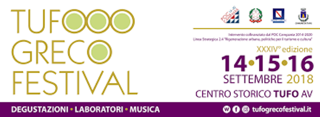 TUFO (AVELLINO) – Il Greco di Tufo protagonista assoluto di uno degli eventi più attesi dell’anno per gli enoappassionati di tutta Italia. Torna il “Tufo Greco Festival”, quest’anno alla sua XXXIVesima edizione, in programma il 14, 15 e 16 settembre 2018 nel centro storico di Tufo (Avellino)