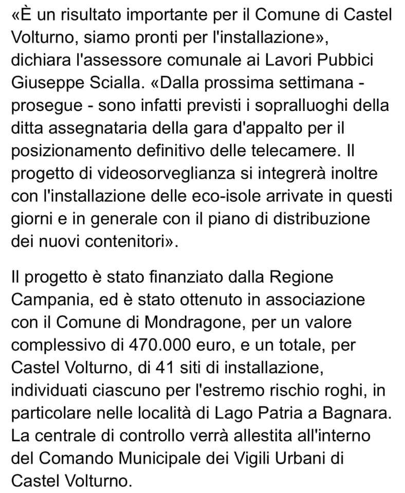 Qui di seguito le parole dell’ex Sindaco di Mondragone  in data 30 agosto 2017  il quale fa preciso riferimento ad uno specifico progetto  finalizzato a tutelare l’ambiente con l’arrivo di nuove telecamere alcune aree della citta’ successivamente colpite dai roghi.