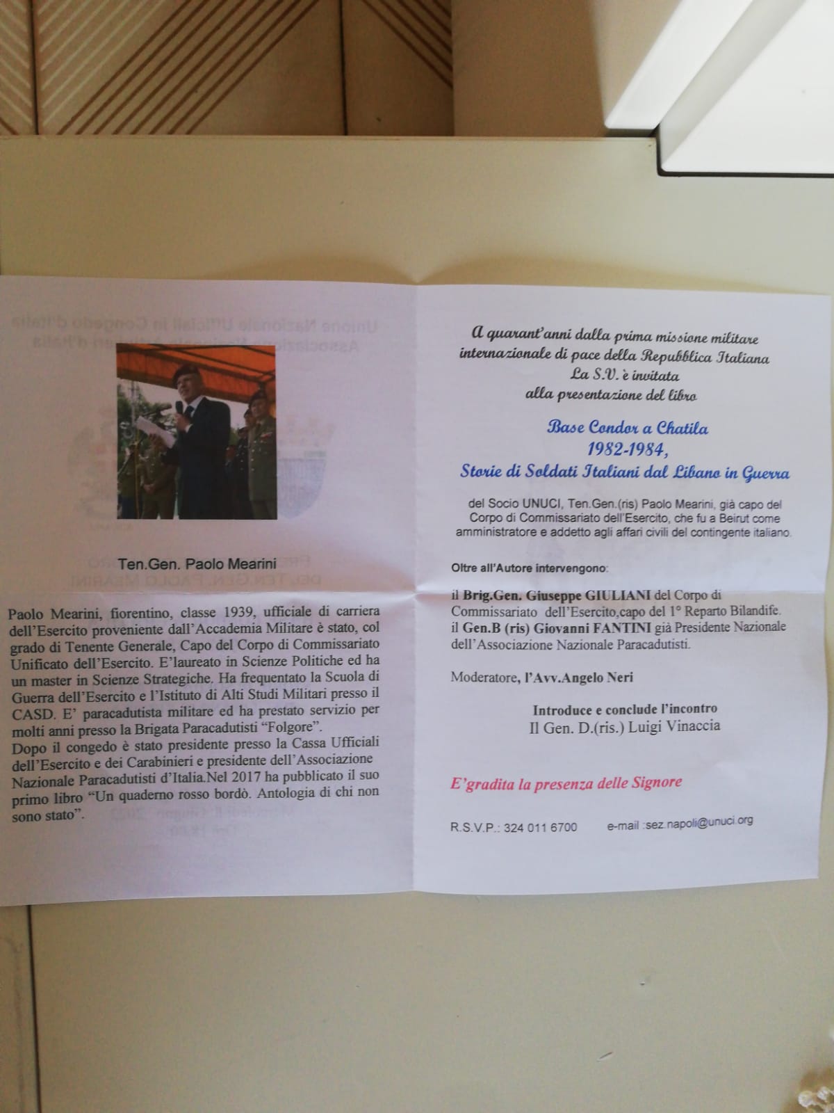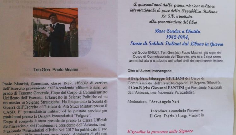 Mercoledi 08 giugno 2022 alle ore 1800 presso il salone del UNUCI di Napoli in Via S. Brigida n. 64 presentazione del libro del Ten. Gen. Paolo Mearini dal titolo Base Condor a Chatila 1982 1984 Storie di Soldati Italiani dal Libano in Guerra. Introduce l’incontro il Gen. Luigi Vinaccia. Oltre all’autore è previsto l’intervento del Gen. Giuseppe Giuliani e del Gen. Giovanni Fantini già presidente nazionale della Associazione Paracadutisti. Per la cronaca il Gen. Paolo Mearini ha prestato servizio a Beirut come amministratore e addetto agli affari civili del contingente italiano.