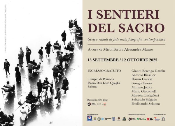 La mostra fotografica I SENTIERI DEL SACRO, Gesti e rituali di fede nella fotografia contemporanea, è visitabile presso il Tempio di Pomona di Salerno. Al suo interno oltre 50 fotografie e un’opera video di nove artisti di rilievo internazionale. Ad esporre Gianni Berengo Gardin, Antonio Biasiucci, Harun Farocki, Giorgia Fiorio, Mimmo Jodice, Mario Giacomelli, Markéta Luskačovà, Sebastião Salgado, Ferdinando Scianna.