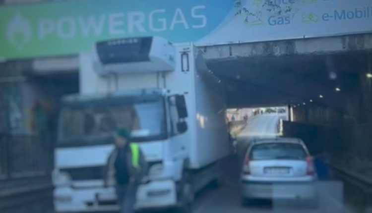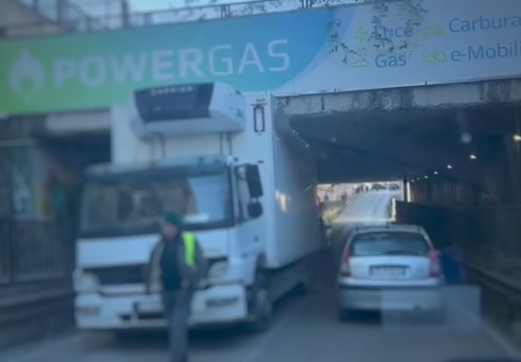Il mezzo si è bloccato rimanendo incagliato contro il soffitto del sottopasso.