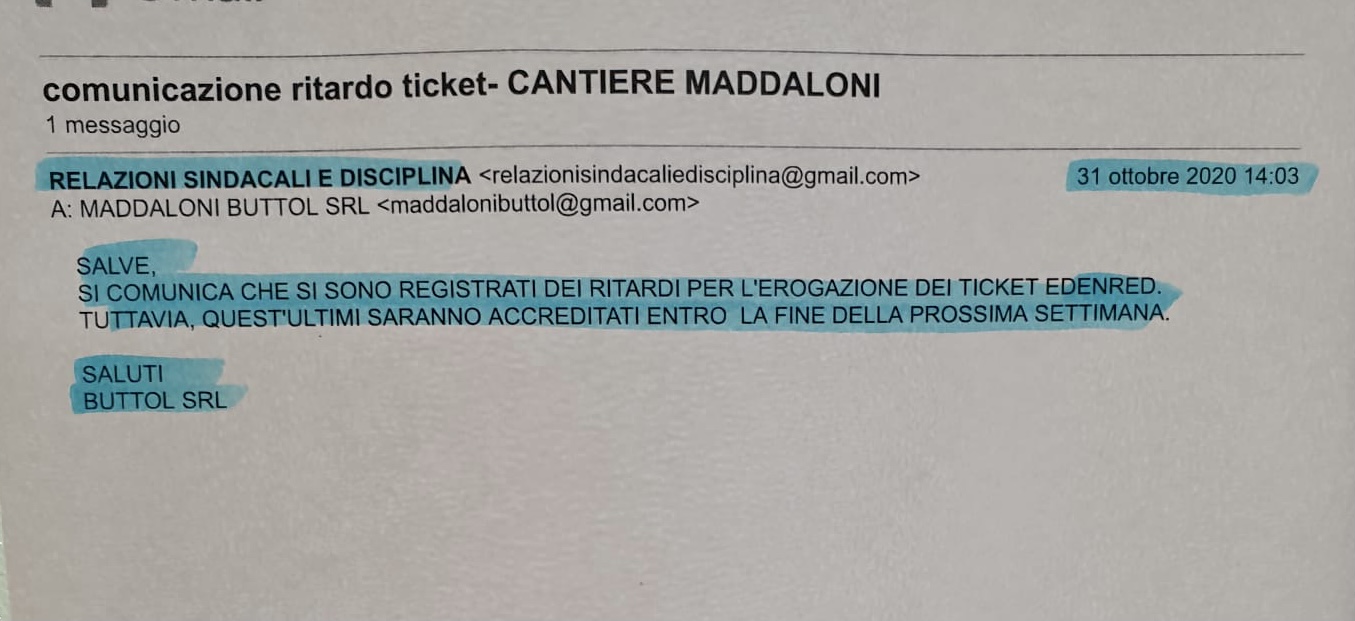 Continua il tira e molla tra la Buttol e i suoi dipendenti. Continuano gli impegni non mantenuti, seppur messi nero su bianco. Porta la data del 31 ottobre la mail con cui la Buttol si impegnava, scusandosi tra l’altro per i ritardi, ad erogare i ticket mensa spettanti ai suoi dipendenti nell’arco di questa settimana. Oggi è sabato e c’è stato segnalato che nemmeno questa volta i ticket sono stati consegnati.
