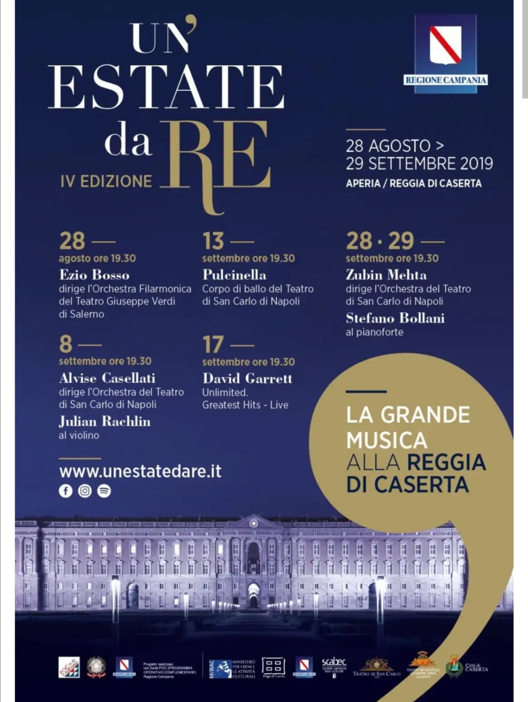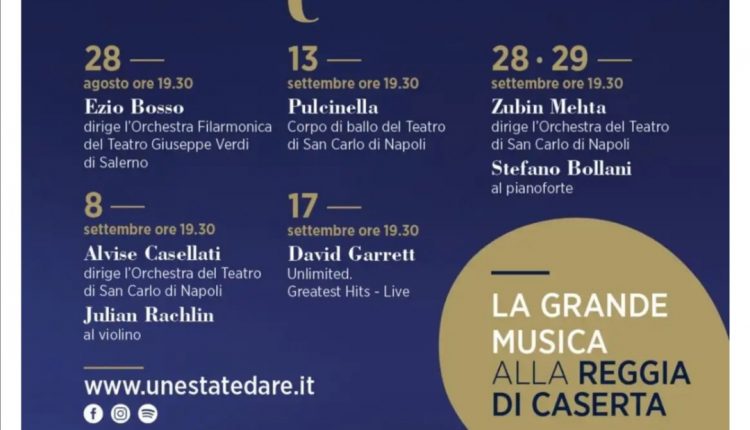 Caserta – Ritorna la 4° edizione del festival Un’Estate da Re, l’appuntamento con la grande musica alla Reggia di Caserta, una location di grande fascino presso il meraviglioso emiciclo dell’Aperia, situato nella parte alta del Parco Reale, incastonato nel Giardino Inglese e restaurato anno dopo anno proprio grazie al festival, che diventa un palcoscenico unico con protagonisti artisti di fama internazionale per tutti gli appassionati della grande musica sinfonica, lirica e del balletto.