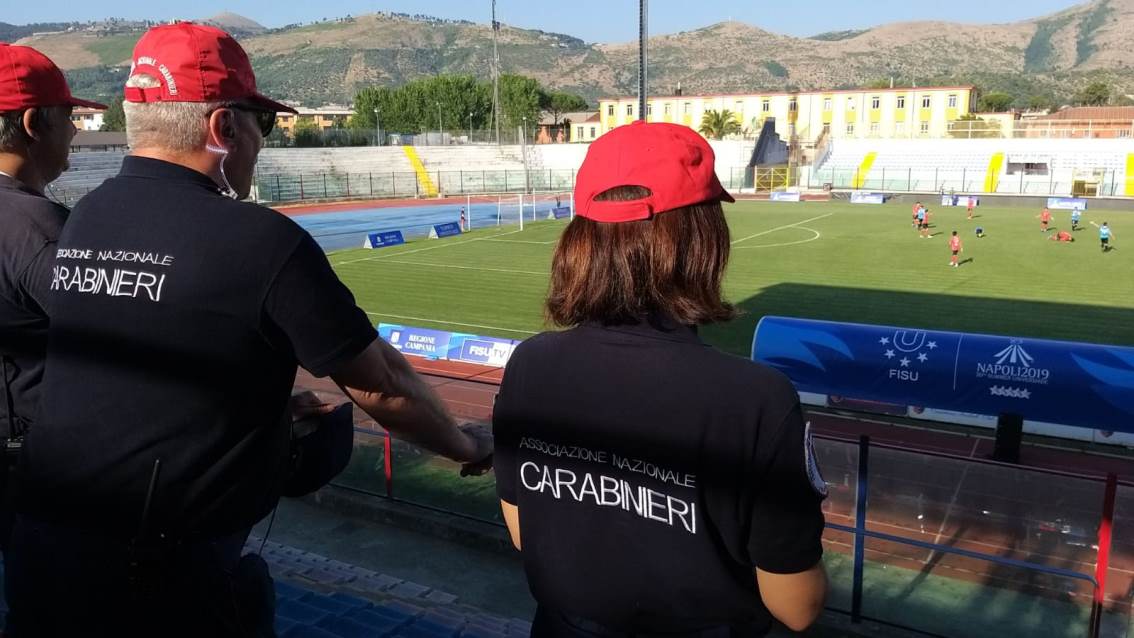 Fra i tanti volontari che stanno offrendo volontariamente il loro contributo per rendere più piacevole l’arrivo di turisti ed universitari, abbiamo notato, con grande entusiasmo, che c’era anche il “Nucleo Reggia dell’Associazione Nazionale Carabinieri”, compresi i volontari ANC di San Nicola la Strada, che con la loro professionalità hanno contribuito a dare una grossa mano alle altre Forze di Polizia ivi presente. Il Nucleo di Volontariato e di Protezione Civile dell’ANC di Caserta presenti dal 2 luglio al 13 luglio 2019 allo Stadio Pinto è composta da: Antonio BRUNO, Ciro NOCERINO, Manuel IANTRO, Antonio CASELLA, Tiziana BIANDUCCI, Carmelo MINASI, Francesco BOCCARDO, Romualdo SILVESTRE, Michele D’ALESSANDRO, Silverio CAMPOFREDA, Nicola PISCITELLI, Eduardo SANTONASTASO, Lorenzo PICCIRILLO, Margherita LANNA, Raffaele AMATO, Maria CIMMINO, Emanuele MINIERO, Pietro GRIMALDI, Ciro CAROTENUTO, Giuseppe FARINA, Mario URZO, Pasquale RAUCCI, Tiberio RAUCCI. Tutti coordinati da Andrea CORAZZA.