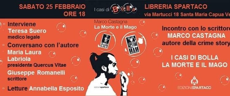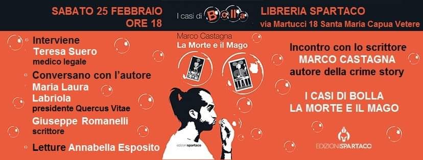 Sabato 25 Febbraio alle ore 18 presento a Santa Maria CapuaVetere alla libreria Spartaco La morte e il Mago di Marco Castagna. Un nuovo detective , Bolla ci appassionera ‘ con le sue vicende. Sui generis perche’ indovino e cartomante ci guidera’ nell’arcano dei suoi tarocchi.