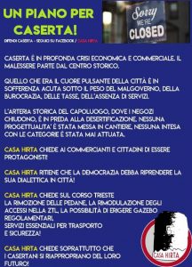 Riceviamo e pubblichiamo un comunicato stampa di “Casa Hirta”, l’Associazione culturale di Caserta: “Caserta è in profonda crisi economica e commerciale. Il malessere parte dal centro storico. Quello che era il cuore pulsante della città è in sofferenza acuta sotto il peso del malgoverno, della burocrazia, delle tasse, dell’assenza di servizi.