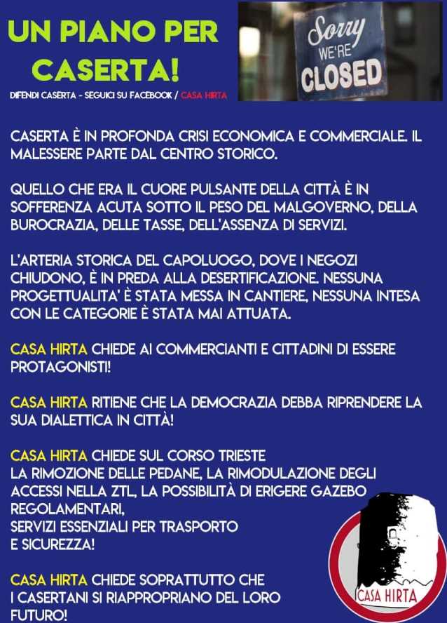 Casa Hirta chiede sul Corso Trieste la rimozione delle pedane, la rimodulazione degli accessi nella ZTL, la possibilità di erigere gazebo regolamentari, servizi essenziali per trasporto e sicurezza. Casa Hirta chiede soprattutto che i casertani si riappropriano del loro futuro”.