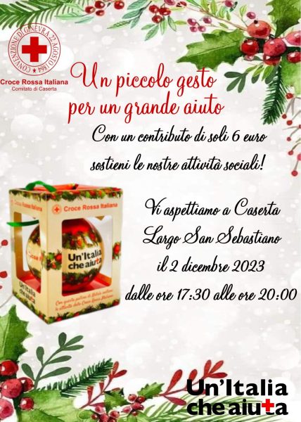 Caserta. La Croce Rossa – Comitato di Caserta scende in Piazza e ancora una volta  lo fa per una giusta causa. Sabato, 2 dicembre 2023 , in Largo San Sebastiano dalle ore 17,30 alle ore 20 un gruppo di volontari CRI  allestirà un gazebo e provvederà , in cambio di un contributo di 6 Euro, alla distribuzione di una bellissima pallina di Natale egregiamente decorata.