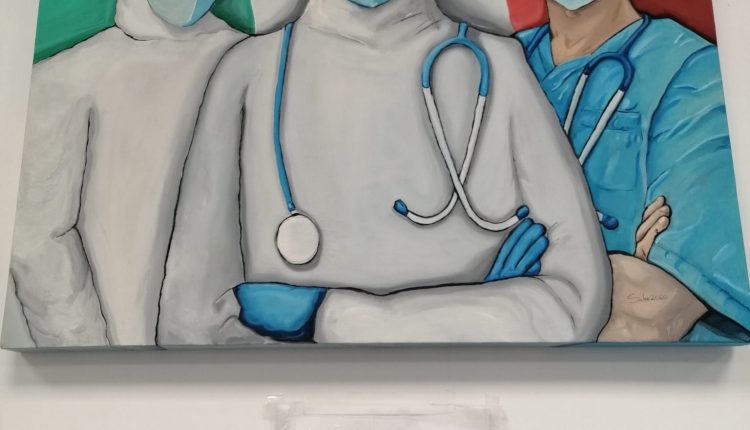 Un giovane artista SaboArt, nome d’arte di Sabino Addezio, ha voluto omaggiare il personale sanitario con una sua rappresentazione artistica. Un dipinto che raffigura tre operatori sanitari “bardati” con mascherine, tute e visiere, esattamente come accade nella realtà da un anno a questa parte ormai. Nei corridoi dei reparti covid si lavora così, con protezioni anticontagio che nascondono le sembianze e rendono oltremodo difficoltoso ogni movimento. Nomi scritti sul retro delle tute per identificarsi e dare un nome alle voci che arrivano da dietro a visiere e mascherine. Il personale sanitario, a volte anche ingiustamente lapidato mediaticamente, da alcuni definiti invece eroi, appellativo che loro rifiutano con forza. Fanno il loro lavoro, dicono e, non mollano, nonostante tutto. chiedono solo rispetto delle regole e del loro lavoro. E continuano a chiederlo, sommessamente, con pazienza e perseveranza, sperando di vedere, come tutti noi, la luce in fondo a questo terribile tunnel che continua a seminare morte.