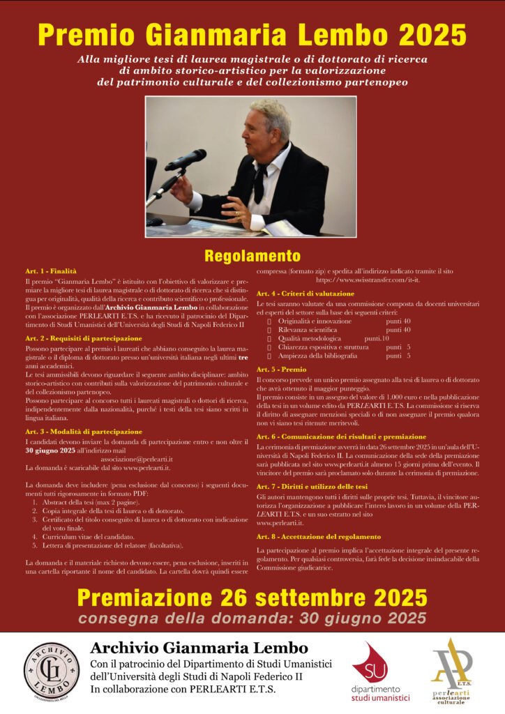 L’Archivio Gianmaria Lembo, con il patrocinio del dipartimento di Studi Umanistici dell’Università degli Studi Umanistici di Napoli Federico II, in collaborazione con PERLEARTI E.T.S., ha istituito il Premio “Gianmaria Lembo” con l’obiettivo di valorizzare e premiare la migliore tesi di laurea magistrale o di dottorato di ricerca che si distingua per originalità, qualità della ricerca e contributo scientifico o professionale. Per saperne di più seguire il seguente link: notizie sulla Borsa di Studio