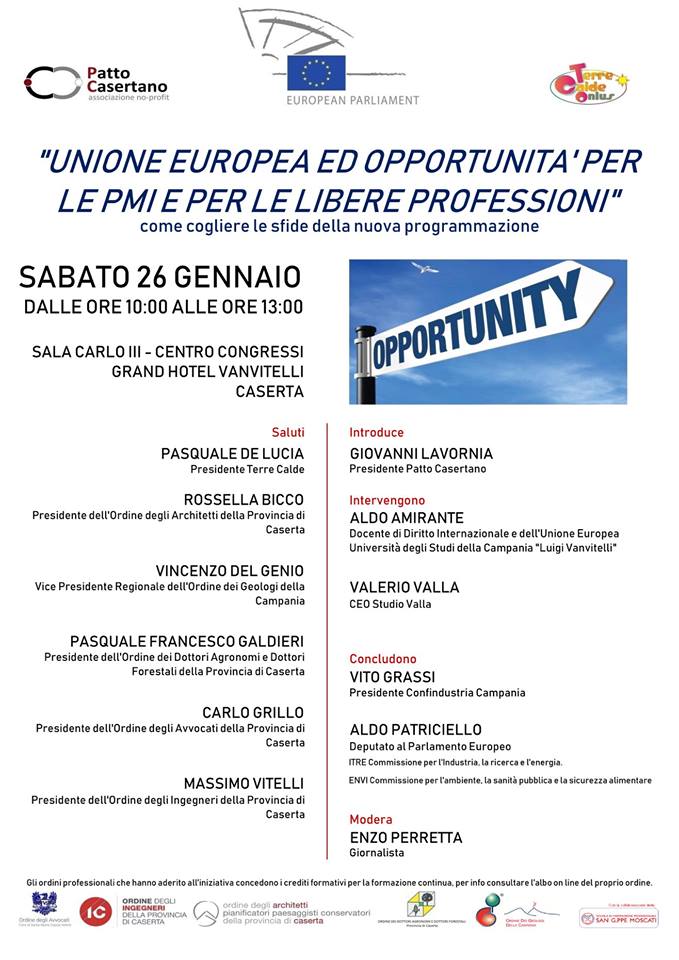 Le opportunità contenute nella nuova programmazione dell’Unione Europea per le piccole e medie imprese e le libere professioni, la capacità di coglierle così da trasformarle in vere e proprie sfide per la crescita del territorio saranno i temi dell’interessante tavola rotonda che Patto Casertano, associazione presieduta da Giovanni Lavornia, ha promosso per sabato prossimo 26 gennaio, con inizio alle ore 10, presso il Grand Hotel Vanvitelli di Caserta.