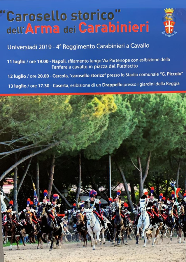 Sabato 13 luglio 2019, presso i Giardini della Reggia, con inizio alle ore 17.30, ci sarà l’esibizione di un Drappello del 4° Reggimento Carabinieri a Cavallo che si esibirà, anche se in formazione ridotta ad un Drappello, nel carosello storico, che si concluderà con la rievocazione della “carica di Pastrengo”, quando i militari salvarono la vita del Re Carlo Alberto costringendo gli austriaci alla ritirata. Lo spettacolo è inserito nell’ambito delle iniziative legate alle Universiadi 2019 di Napoli.