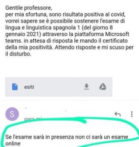 Ecco qui la prova, uno studente che chiede aiuto ad un professore per poter svolgere un esame a distanza a causa covid (cosa che dovrebbe essere un diritto dato le circostanze), ed un professore che risponde così. O è bianco o e nero. Non ci si può venire incontro nemmeno in un momento simile. L’8 gennaio inizia la nostra sessione di esami invernale e non sappiamo nemmeno se dobbiamo recarci in presenza o se saranno online . Ma si rende conto? Appesi ad un filo così?