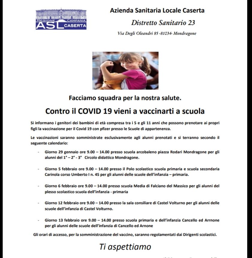 “Contro il Covid vieni a vaccinarti a scuola” è l’appello con cui l’ASL Caserta, Distretto Sanitario 23, vuole coinvolgere le famiglie – facendo squadra per le salute dei propri figli – al fine di salvaguardare il benessere dei bambini che non dispongono delle necessarie difese contro il virus. Agli alunni, nella fascia di età 5-11 anni, secondo orari regolamentati dai Dirigenti scolastici, sarà consentito l’ accesso ai plessi di riferimento nei Comuni di Mondragone, Carinola, Falciano del Massico, Castel Volturno e Cancello Arnone per la somministrazione del vaccino Pfizer.
