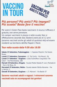 Sarà possibile ricevere solo la prima dose del vaccino anti Covid-19 (non si effettueranno seconde dosi, i “richiami” saranno programmati presso il centro di vaccinazione più vicino), a bordo dell’unità mobile nel corso del suo tour nelle scuole, dalle ore 9.00 alle ore 18.00, a cui potranno accedere senza necessità di alcuna prenotazione gli over 12 residenti sul territorio dell’ASL Napoli 2 Nord.