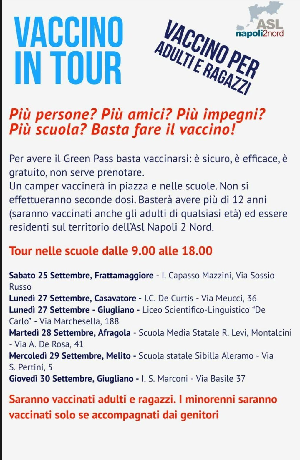 Prosegue l’iniziativa dei “Vaccini in Tour” con un nuovo Open Day, annunciato dall’ASL Napoli 2 Nord, che vedrà il camper sanitario itinerante fare tappa da sabato 25 a giovedì 30 settembre nelle scuole del napoletano, interessando, in particolare, i Comuni di Afragola, Giugliano, Melito, Casavatore e Frattamaggiore.