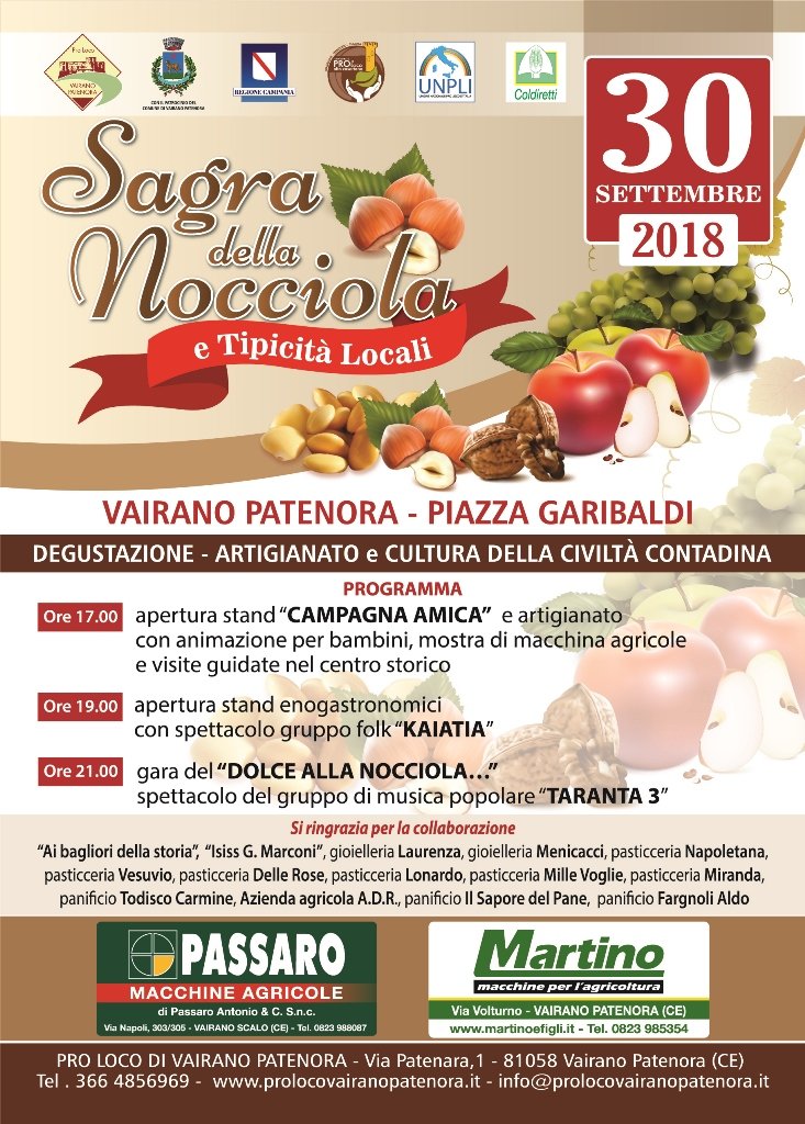 VAIRANO PATENORA (Daniele Palazzo) – Nonostante manchino ancora due settimane piene alla celebrazione dell’edizione 2018 della “Sagra della Nocciola”, di Vairano Patenora, i giovani della Pro Loco, organizzatori dell’atteso evento, non si risparmiano, dando ulteriore testimonianza di un attaccamento al valori e alle potenzialità di una città, quella di Vairano Patenora, appunto, che, dobbiamo dire, rappresenta uno dei centri turisticamente più importanti e “gettonati” dell’intero territorio dell’Alto Casertano. “Se, oggi, la nostra città, afferma uno dei membri più attivi e propositivi del citato organismo sociale(per espresso volere dell’interessato, non ne pubblichiamo le generalità), ha guadagnato e saputo guadagnare “punti pesanti” nella classifica dei centri più ambiti dalle masse turistiche, a vocazione non solo culturale, che scelgono il comprensorio dell’Alto Casertano per trascorrervi parte del loro programma di svago e relax, è stato grazie anche all’ultraquarantennale contributo offerto dalla Pro Loco di Vairano Patenora, sul cui operato, praticamente, da sempre, la critica è stata ed è solo ed unicamente positiva ed anche i risultati.” L’evento settembrino del cartellone di manifestazioni vairanesi, durante il quale, oltre alla prelibata nocciola zonale, troveranno spazio ed esaltazione anche altre prelibatezze dell’agricoltura ed anche dell’artigianato enogastronomico della zona di riferimento, prenderà inizio alle ore 17.00 di domenica, 30 settembre 2018, protraendosi fino a tarda sera della stessa giornata. Nel corso ghiotto momento celebrativo, tra degustazioni, vendita e nuove ed originali trovate promozionali circa la nocciola e le altre eccellenze della più che generosa agricoltura locale, a beneficio di tutti i buongustai intervenuti(come nella passate uscite della medesima festa, molti arriveranno anche da regioni più o meno limitrofe alla nostra), si potrà godere anche dell’ottimo intrattenimento musico-folkloristico delle note formazioni musicali dei “Kalatia” e dei “Taranta 3”, il cui vasto e variegato repertorio, costituito da una possente ossatura popolare, manco a dirlo, si presenta ad hoc con l’evento in trattazione. Dalle ore 21.00 in poi, anche l’attesa gara culinaria del “Dolce alla Nocciola”, che, per l’ambito premio finale, vedrà all’opera numerose ed esperte massaie vairanesi e dei centri viciniori. Come si sarà compreso, ci sono davvero tutti i presupposti perché la kermesse vairanese trovi il successo che merita…Vedere per credere. A beneficio di tutti coloro che ne avessero bisogno, la Pro Loco di Vaiano Patenora pone a disposizione i seguenti canali info: 3406230771, 3664686969, info@prolocovairanopatenora.it e www.prolocpvairanopatenora.it.