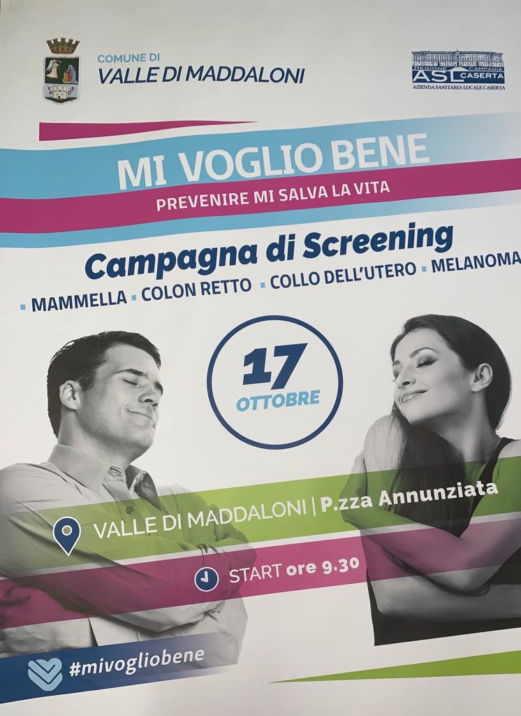 Per il terzo anno consecutivo, l’Amministrazione Comunale di Valle di Maddaloni aderisce al programma ” Mi voglio bene “ della Regione Campania – ASL Caserta – che sostiene la prevenzione oncologica con un’assistenza diagnostica tempestiva, specializzata e gratuita. Lo screening gratuito per la prevenzione dei tumori dell’utero, del colon, della mammella e dei melanomi ci sarà il giorno 17 ottobre in piazza Annunziata a partire dalle ore 9.30.