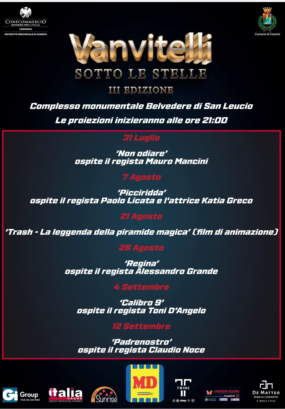 Caserta.‘Vanvitelli sotto le stelle’, si riparte. La rassegna di cinema all’aperto ideata da Confcommercio Caserta tornerà infatti ad animare anche quest’anno l’estate di chi resta in città. Sei serate di grande cinema, tutte ad ingresso gratuito, in programma dal 31 luglio al 12 settembre nello splendido scenario del Real Belvedere di San Leucio. Giunta alla terza edizione, la manifestazione – patrocinata dal Comune di Caserta – si candida a diventare dunque un vero e proprio Festival cinematografico con ospiti d’eccezione, riconoscimenti, premi e tante sorprese. Si parte sabato 31 luglio alle ore 20,30 con una serata evento che sarà presentata da Francesco Massarelli, direttore artistico della rassegna. Saranno presenti il presidente di Confcommercio Caserta, Lucio Sindaco, il sindaco di Caserta, Carlo Marino, l’assessore agli eventi Emiliano Casale. Il primo film in cartellone è ‘Non odiare’. Ospite della serata il regista Mauro Mancini che incontrerà il pubblico subito dopo la proiezione. Una storia vera, quella interpretata da Alessandro Gassmann, qui nel suo ruolo forse più bello e viscerale. Candidato a 4 Nastri d’Argento e 3 David di Donatello, il film è stato presentato lo scorso anno anche alla Settimana internazionale della Critica della Mostra del Cinema di Venezia. Racconta la storia di un medico ebreo che trovandosi di fronte al dilemma di salvare o meno un uomo che ha appena subito un incidente stradale, decide di abbandonarlo al suo destino quando scopre che ha una svastica tatuata in più parti del corpo. L’uomo sarà però dilaniato dai sensi di colpa, e cercherà di aiutare quel che resta della famiglia dell’uomo per rimediare al suo conflitto morale. Nel corso della serata di sabato 31 luglio ci saranno però anche altre sorprese cinematografiche tutte da scoprire. Secondo appuntamento sabato 7 agosto con il film ‘Picciridda’ tratto dall’omonimo romanzo di Catena Fiorello. Sul palco del Belvedere per l’occasione ci saranno il regista Paolo Licata e l’attrice Katia Greco. Una pellicola che racconta il fenomeno dell’emigrazione passiva negli anni Sessanta, ovvero quella di chi è rimasto nel luogo natale e deve fare i conti con il senso di abbandono e l’impossibilità di comunicare con i propri cari partiti. La rassegna proseguirà sabato 21 agosto con il cartoon ‘Trash – La leggenda della piramide magica’, opera prima di Luca della Grotta e Francesco Dafano che ambientano le loro creature di animazione in luoghi reali per dare vita ad una storia tenera e ispiratrice di riscatto che passa attraverso il riutilizzo dei rifiuti. Sabato 28 agosto riflettori accesi su ‘Regina’, liberamente ispirato a ‘Il complesso di Telemaco’ di Massimo Recalcati, con Francesco Montanari e Ginevra Francesconi. Ospite della serata sarà il regista Alessandro Grande. Presentato al Torino Film Festival, ‘Regina’ ha ottenuto anche una candidatura ai Nastri d’Argento. Una storia di formazione che, per una volta, vede il personaggio adulto più bisognoso di diventare grande di quello adolescente. Altro appuntamento interessante quello di sabato 4 settembre con il regista Tony D’Angelo che porterà al Belvedere di San Leucio il suo ultimo lavoro ‘Calibro 9’ interpretato da Marco Bocci, Ksenia Rappoport, Barbara Bouchet, Michele Placido e Alessio Boni. Un affresco impietoso sulla ndrangheta, fra le più influenti organizzazioni criminali al mondo, e soprattutto un omaggio a ‘Milano Calibro 9’, che ha fatto epoca nel 1972 e del quale questo film rappresenta il sequel. Gran finale il 12 settembre con ‘Padrenostro’ del regista Claudio Noce che incontrerà il pubblico casertano. Il film premiato a Venezia è un bellissimo e straziante ritratto di un rapporto padre-figlio. Con un magistrale Pierfrancesco Favino che per questa interpretazione ha ottenuto la Coppa Volpi. Tutte le proiezioni inizieranno alle ore 21,00. I biglietti per assistere alle proiezioni gratuite potranno essere ritirati a partire da martedì pomeriggio 27 luglio nei punti vendita dei partner della rassegna e precisamente nei supermercati MD di San Nicola la Strada, Casagiove, Tredici e Curti, da Vanessa Sound in via Tescione a Caserta, alla pizzeria Sunrise di via Roma a Caserta, alla concessionaria Twins Volkswagen di Marcianise, al negozio di abbigliamento De Matteo uomo di Santa Maria a Vico. Partner della rassegna anche le società Italia Paghe e Gi Group.