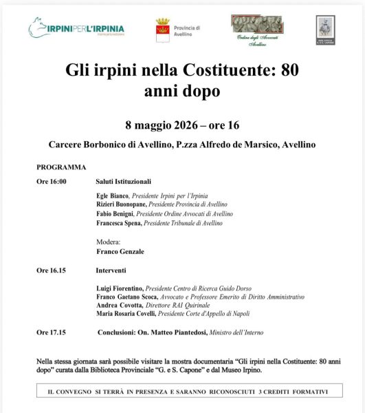 L’ Associazione Irpini per l’Irpinia e l’ Ordine degli avvocati di Avellino, promuovono l’incontro “Gli Irpini nella Costituente: 80 anni dopo” che si terrà venerdì 8 maggio alle ore 16:00 presso il Carcere Borbonico di Avellino. Si pubblica il programma, che prevede un dibattito sui padri costituenti irpini arricchito dalle testimonianze di Franco Gaetano Scoca, figlio del padre costituente Salvatore Scoca, Avvocato e Professore Emerito di Diritto Amministrativo, e Maria Rosaria Covelli, Presidente della Corte d’Appello di Napoli , figlia del padre costituente Alfredo Covelli. A concludere i lavori l’intervento di Matteo Piantedosi, Ministro dell’Interno.