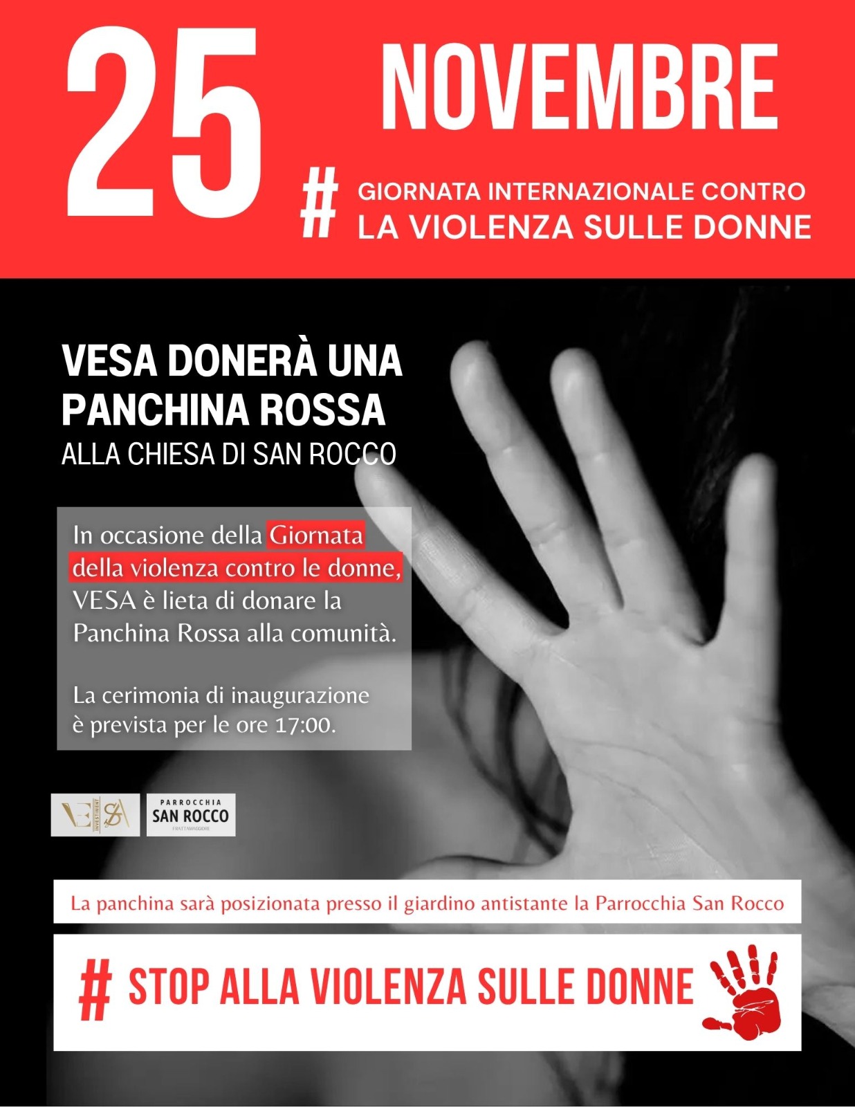 In occasione della Giornata Internazionale contro la Violenza sulle Donne, Vesa Investiment Srl annuncia la donazione di una panchina rossa alla comunità di Frattamaggiore (Napoli), come simbolo di impegno concreto nella lotta contro ogni forma di violenza di genere. La cerimonia di inaugurazione martedì 25 novembre alle ore 17 nella Chiesa di San Rocco, alla presenza di cittadini, associazioni e rappresentanti del territorio.