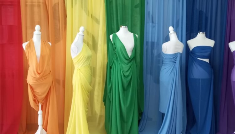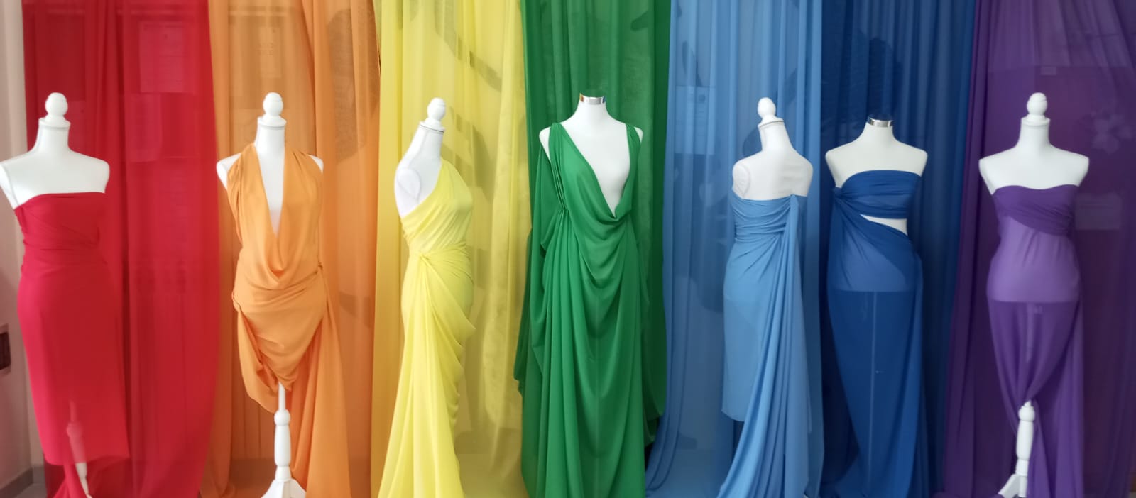 Da questo arcobaleno di colori che pendono sotto forma di drappi verranno realizzati, sotto la guida della professoressa Rosanna De Lucia, degli abiti in presa diretta, secondo la tecnica del moulage: una tecnica sartoriale che genera abiti direttamente sul corpo del modello.