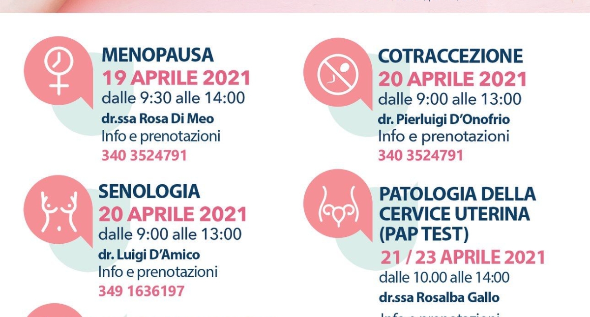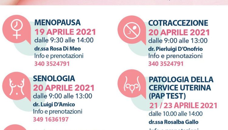 Villa Fiorita aprirà le porte da domani lunedì 19 aprile e fino a sabato prossimo 24 aprile alle pazienti per offrire gratuitamente visite e consulti e saranno distribuite brochure e locandine informative su alcune delle principali malattie femminili, secondo il seguente calendario: domani lunedì 19 aprile toccherà al tema della Menopausa con la ginecologa Rosa Di Meo (per info e prenotazioni: 340 3524791); martedì 20 sarà la volta sia della senologia con il chirurgo senologo Luigi D’amico sia della contraccezione con il ginecologo Pierluigi Maria D’Onofrio (per info e prenotazioni 349 1636197); mercoledì 21 e venerdì 23 aprile riflettori accesi sulla patologia della cervice uterina con pap test a cura della ginecologa Rosalba Gallo (per info e prenotazioni 340 3524791); infine, sabato 24 spazio alla uroginecologia con il ginecologo Michele Renzo (per info e prenotazioni 349 1636197).