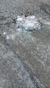 Maddaloni. Via De Curtis la strada dei disagi. Il manto stradale, specie dopo le ultime piogge torrenziali, ne è uscito abbastanza dissestato, con tanto di crateri di varie dimensioni, uno dei quali, stamattina, veniva riempito, come si vede, in maniera artigianale, da alcuni residenti del posto.
