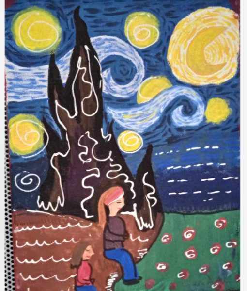 Tra i lavori proposti è risultato vincente quello di Anna Cecere, che ha riproposto una sua versione della Notte stellata di Van Gogh. “L’allieva, partendo dalle radici antiche del passato, che funge da contesto, propone una lettura di futuro affidata a due giovani protagonisti inseriti in primo piano” questo uno stralcio della motivazione della giuria, che potete ascoltare integralmente nella lettura della dirigente Nespoli nel video che segue. Complimenti Anna, piccola grande artista e ad maiora.