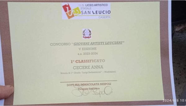 Oggi vi diamo la notizia della vittoria di un prestigioso concorso scolastico da parte di Anna Cecere. Anna frequenta il Liceo artistico “San Leucio”, da diversi anni guidato dalla dirigente Imma Nespoli, preside che ha fatto decollare questo istituto grazie alla sua grande professionalità e alla sua dedizione alla scuola . Tra le innumerevoli attività proposte agli studenti, volte a valorizzare al meglio le loro attitudini c’è stato questo concorso rivolto agli alunni delle scuole medie dal titolo “Giovani artisti leuciani”