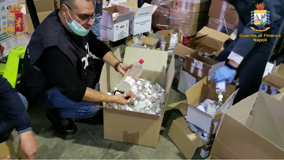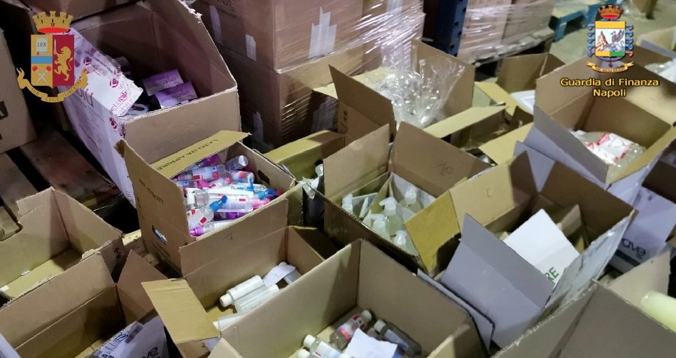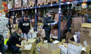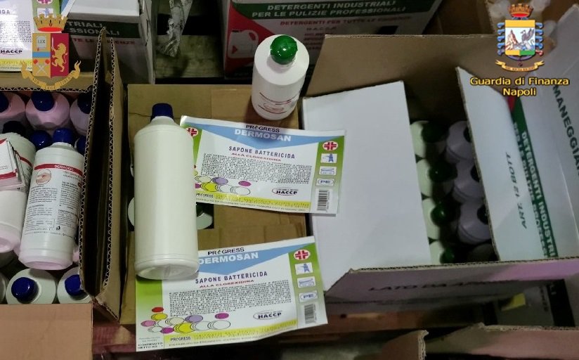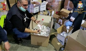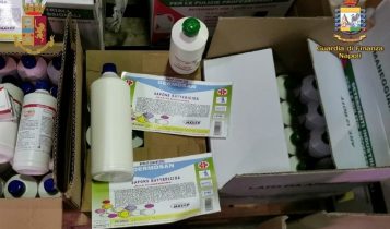Dopo essere entrati nella struttura, gli agenti hanno sorpreso tre persone impegnate nell’attività di confezionamento di un gel igienizzante/disinfettante per le mani ed hanno trovato numerose scatole di prodotti già realizzati ed altre contenenti flaconi vuoti ed etichette nonché 25 taniche di candeggina da 5 litri utilizzate per la realizzazione del prodotto.