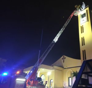 Stasera a Caserta, come da sempre a Napoli per tradizione a Piazza del Gesù, i vigili del fuoco rendono omaggio alla Madonna. In occasione della celebrazione della messa serale per l’Immacolata Concezione, che si è celebrata oggi, il corpo dei Vigili de Fuoco di Caserta, muniti di autoscala, si sono recati alla chiesa del Buon Pastore per depositare, al termine della celebrazione, una corona di fiori. Un evento suggestivo ed emozionante realizzatosi sfidando il maltempo.Una tradizione che si ripete dal 2014 nella città di Caserta. I fedeli commossi hanno intonato canti alla Vergine mentre venivano deposti i fiori dinanzi alla statua posta sul campanile della chiesa.