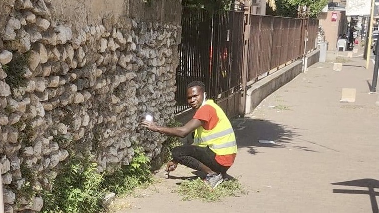 Vive a Villa Literno, dove lavora come stagionale raccogliendo frutta e pomodori, ha una moglie e un bimbo di 2 anni e mezzo. Si trova in Italia perché ama il nostro paese e lo sta dimostrando con azioni concrete, dedicandosi, autonomamente, a ripulire strade e marciapiedi da erbacce e rifiuti. Anche sotto il sole cocente di questa mattina.