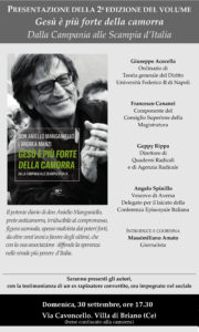 Domenica 30 settembre, alle 17,30, sarà presentata per la prima volta al pubblico la nuova edizione di “Gesù è più forte della camorra” (prefazione del vescovo emerito Raffaele Nogaro). Il libro racconta le vicende dalle quali origina il percorso associativo di “Ultimi”, l’associazione contro le mafie e per la legalità, fondata da don Aniello Manganiello e presieduta dal giornalista Andrea Manzi, che in sei anni di attività (dal 2012) conta già 19 presidi in Italia, di cui gran parte in Campania, nelle aree di maggiore presenza e invasività della criminalità organizzata.