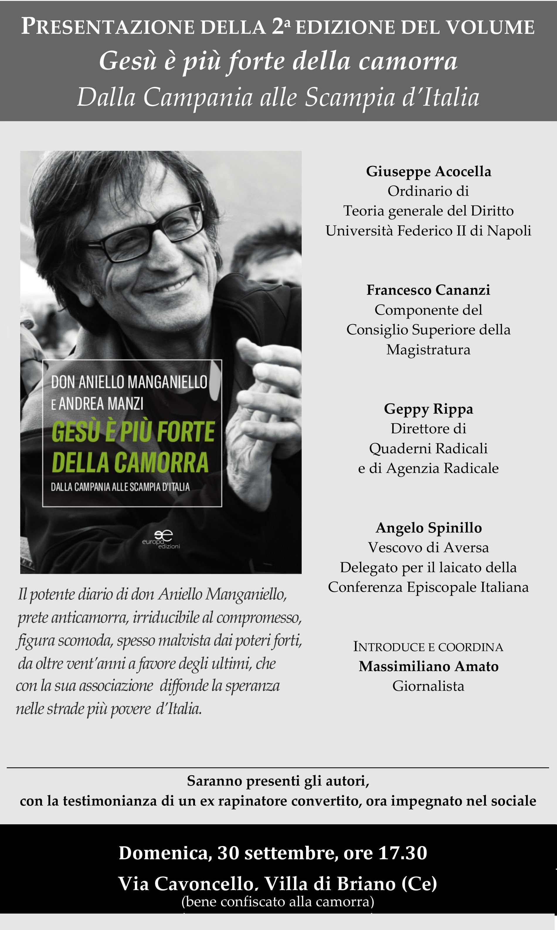 Domenica 30 settembre, alle 17,30, sarà presentata per la prima volta al pubblico la nuova edizione di “Gesù è più forte della camorra” (prefazione del vescovo emerito Raffaele Nogaro). Il libro racconta le vicende dalle quali origina il percorso associativo di “Ultimi”, l’associazione contro le mafie e per la legalità, fondata da don Aniello Manganiello e presieduta dal giornalista Andrea Manzi, che in sei anni di attività (dal 2012) conta già 19 presidi in Italia, di cui gran parte in Campania, nelle aree di maggiore presenza e invasività della criminalità organizzata.