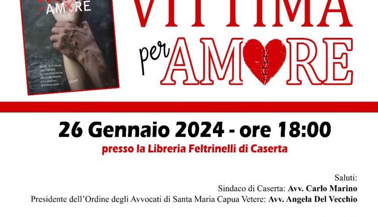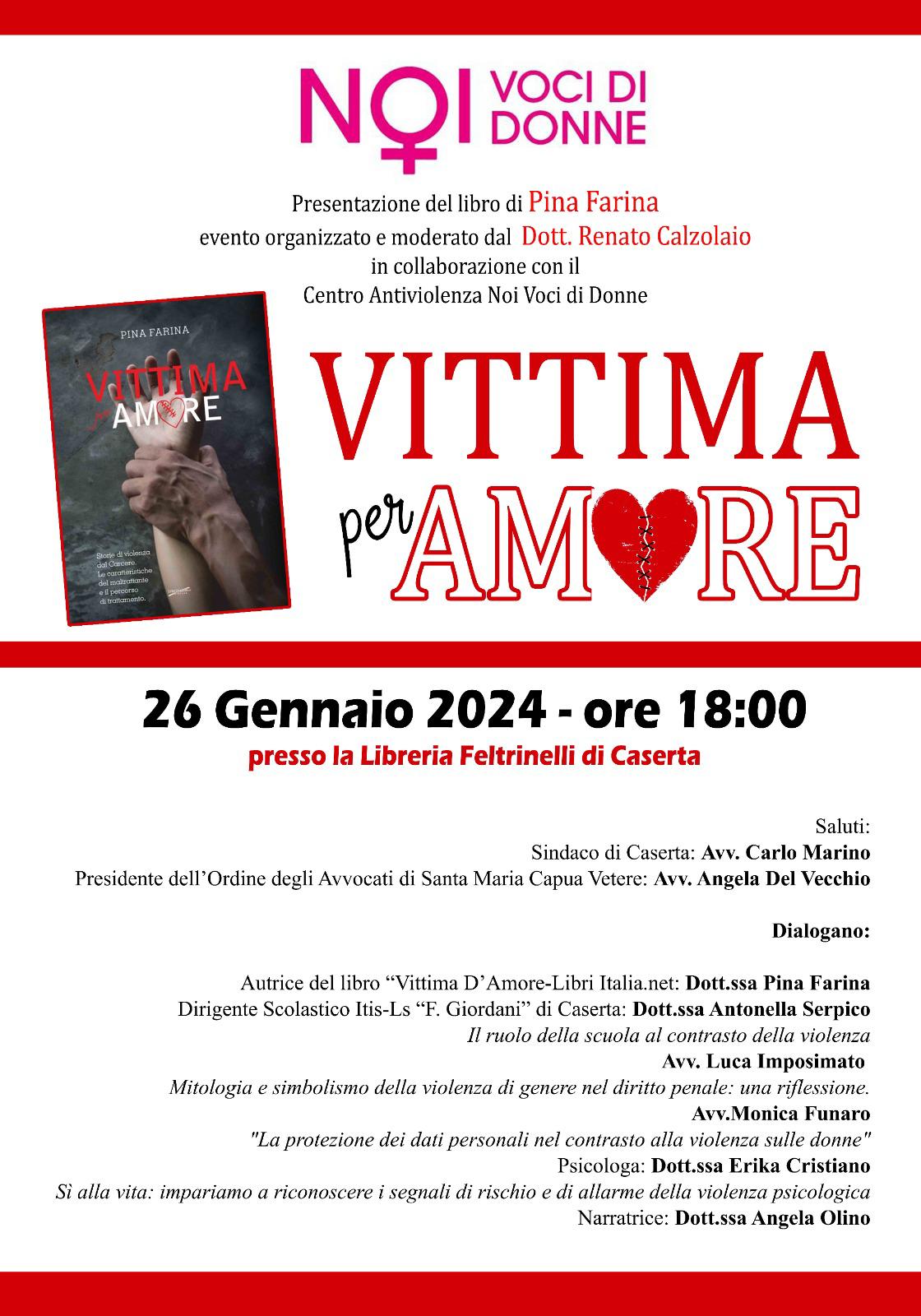 Presso la libreria Feltrinelli di Caserta il 26 gennaio alle ore 18.00 sarà presentato il libro “Vittima per amore” con l’autrice Pina Farina, Presidente dell’associazione Noi Voci di Donne. Questo evento organizzato e moderato dal Dott. Renato Calzolaio, si propone di coinvolgere la comunità ed esperti che operano nel settore della giustizia, della scuola e del supporto psicologico in un dialogo aperto sulle strazianti storie di violenza, partendo dalle pagine del libro, con la narratrice Dott.ssa Angela Olino, per affrontare l’urgente necessità di sradicare quei comportamenti che circondano la violenza, la manipolazione emotiva, la violazione dei diritti, il controllo, l’abuso nelle sue forme, affinché nessuno debba essere etichettato “vittima d’amore”.