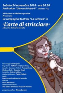 VITULAZIO – Sabato 24 novembre 2018, con inizio alle ore 20.30, presso l’Auditorium “Giovanni Paolo II” sito nel Centro Parrocchiale Maria SS. dell’Agnena in Vitulazio, “ARTinsieme” e “Sibylla Burgundiae” hanno presentato la Compagnia teatrale “La Caterva” nella commedia, in costume settecentesco, dal titolo “L’arte di strisciare”