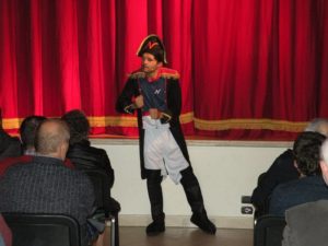 . Con stile satirico e pungente senza pari, esso ridicolizza, ancora oggi, il cuore del sistema di potere, così come quest’ultimo si configura tra i palazzi e le dimore dei novelli ‘notabili’ precipitati dalle varie “Ruote della Fortuna” con tutto quanto ne consegue in termini di ciambellani, dignitari, consiglieri, avvocati, maggiordomi, medici, preparatori atletici, cuochi, giardinieri, menestrelli, giullari, guardie, servi, ciarlatani, ruffiani e cortigiane, queste ultime nel frattempo evolutesi nelle varie forme di parlamentari, ministre, show-girl ed escort. Il servilismo sciocco, vacuo, volgare, di un tempo eterno che si ripete uguale a se stesso, ma sempre e solo in termini di farsa”. Rosario Santella, napoletano, nasce nel 1964, avvocato, autore e sceneggiatore di diverse “pièce” teatrali, tra cui le più recenti “Sibilia di Borgogna” (2009), “Eleonora” (2010), “Innocenzo III, l’antipapa” (2011) e “Lu quatro a oglio (2012) nonché autore di diversi corti cinematografici (con numerosi e importanti premi vinti) e scrittore di successo: l’ultima menzione speciale e pubblicazione nella raccolta antologica del premio “Il Biciclettario” (2016-2017), con i racconti “Nudo e senza meta” e “Il cavaliere elettrico”. La rappresentazione si è avvalsa degli interpreti: Francantonio, Raffaele Sepe