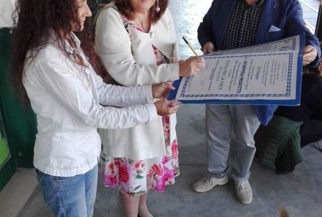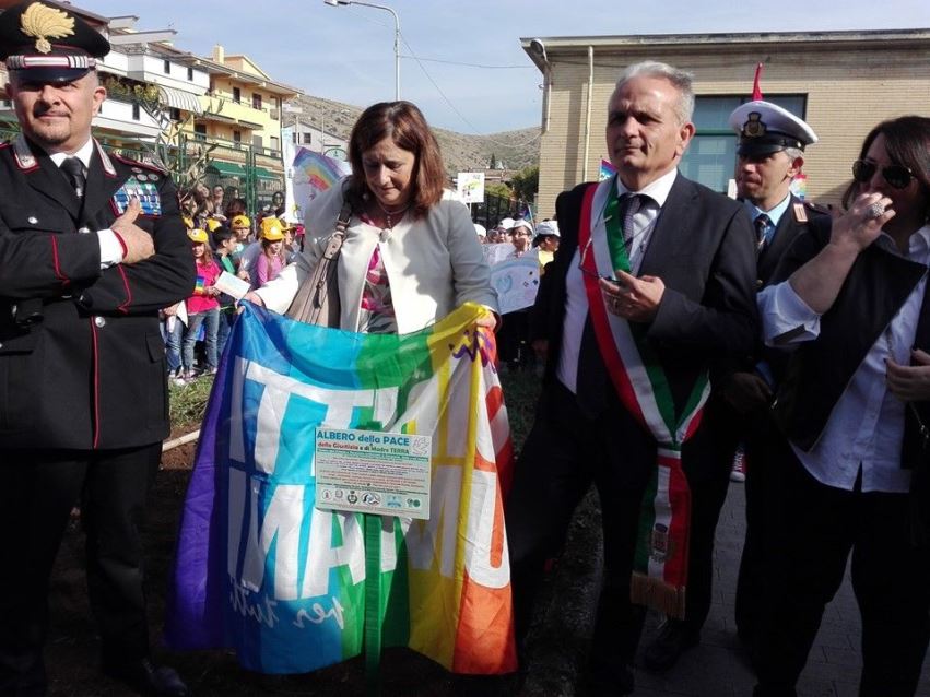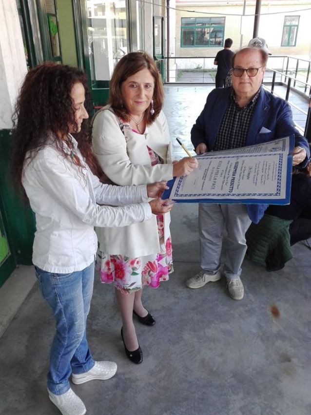 Quindi il saluto della Dirigente scolastica Presutto che ha sintetizzato con la bellissima frase: “La Pace non può regnare tra gli uomini se non regna prima nel cuore di ciascuno di loro” quale deve essere l’impegno di ciascuno di noi. A seguire ancora il saluto della Presidente del Movimento Internazionale per la Pace Agnese Ginocchio, che ha ringraziato l’Istituto Comprensivo e la Dirigente per l’impegno profuso. Presente anche il Preside Luca Antropoli, “Socio Onorario” del Movimento per la Pace, il quale manifestando la propria gioia per aver condiviso questo momento di forte impegno educativo, ha riferito che la Pace è vita e la vita come la Pace vanno difese sempre.