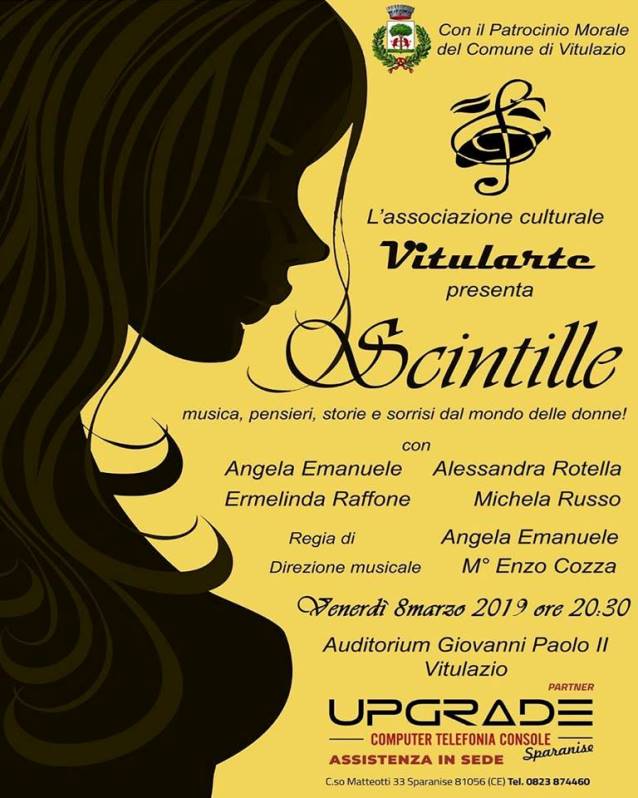 Lo spettacolo “Scintille” ha come tematica la figura delle donne nel tempo e le varie età della vita di una donna. È stato inteso leggero, senza voler troppo insistere sul discorso della denuncia, tuttavia presenterà molti spunti di riflessione. La struttura dello spettacolo è costituita da monologhi, dialoghi, brevi scene e canzoni. Lo spettacolo che vede la partecipazione di Angela Emanuele, sia in qualità di regista che di attrice, di Alessandra Rotella, Ermelinda Raffone, Michela Russo, con la direzione musicale del M° Enzo Cozza, è un evento ideato e portato avanti dall’Associazione culturale “Vitularte” proprio nel giorno dedicato alla Festa della Donna.