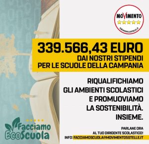 VOLLA (NA) – “Con i deputati ed i senatori del MoVimento 5 Stelle abbiamo messo a disposizione 3 milioni di euro ricavati dalle restituzioni degli stipendi da parlamentare per progetti che portino nelle scuole italiane il tema della sostenibilità ambientale. I fondi saranno distribuiti su base regionale e a disposizione della CAMPANIA ci sono 339.566,43 euro” Ad affermarlo è il Consigliere comunale di Volla del Movimento 5 Stelle Dora TAFONE.