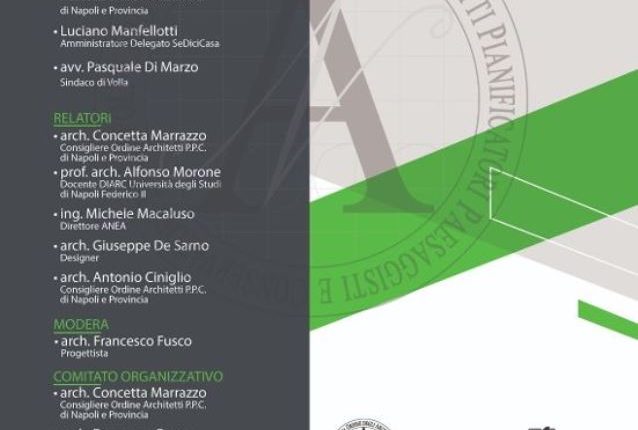 prof. Arch. Alfonso Morone, Docente DIARC Università degli Studi di Napoli “Federico II”; ing. Michele Macaluso, direttore ANEA; arch. Giuseppe De Sarno, Designer; arch. Antonio Ciniglio, Consigliere Ordine Architetti P.P.C. Di Napoli e Provincia. Modera: arch. Francesco Fusco, Progettista. Comitato Organizzativo: arch. Concetta Marrazzo, arch. Francesco Fusco, arch. Angelo Di Lorenzo, membro Dipartimento Politiche Urbane e Periferia Ordine Architetti P.P.C. Di Napoli e Provincia; Agostino della Cioppa, Designer; Costantino Panella, Designer.