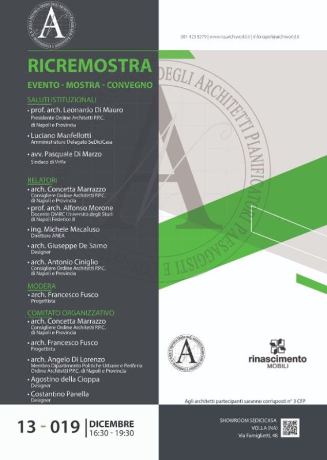 VOLLA – Arriva nella città di Volla la mostra dedicata al riciclo presso SeDiciCasa di via Famiglietti. L’evento sarà presentato venerdì 13 dicembre 2019 a partire dalle ore 16:30 e vede il patrocinio dell’Ordine Architetti Pianificatori Paesaggisti Conservatori di Napoli e Provincia. Saluti istituzionali: prof. Arch. Leonardo Di Mauro presidente Ordine Architetti P.P.C. Di Napoli e Provincia; Luciano Manfellotti, Amministratore Delegato SeDiciCasa; Avv. Pasquale Di Marzo, sindaco di Volla. Relatori: arch. Concetta Marrazzo, Consigliere Ordine Architetti P.P.C. Di Napoli e Provincia;