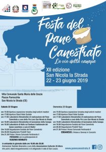 Giunta alla XII edizione, la Festa del “Pane Canestrato si terrà nella Villa Comunale “Santa Maria delle Grazie” nei giorni di sabato 22 e domenica 23 giugno 2019, con l’apertura dell’esposizione tematica degli antichi mestieri a cominciare dalle ore 15.30. La Festa del Pane Canestrato nasce per ricordare e celebrare la tradizione del pane fatto in casa, che si metteva a crescere nelle piccole canestre di vimini, le cosiddette canestrelle.