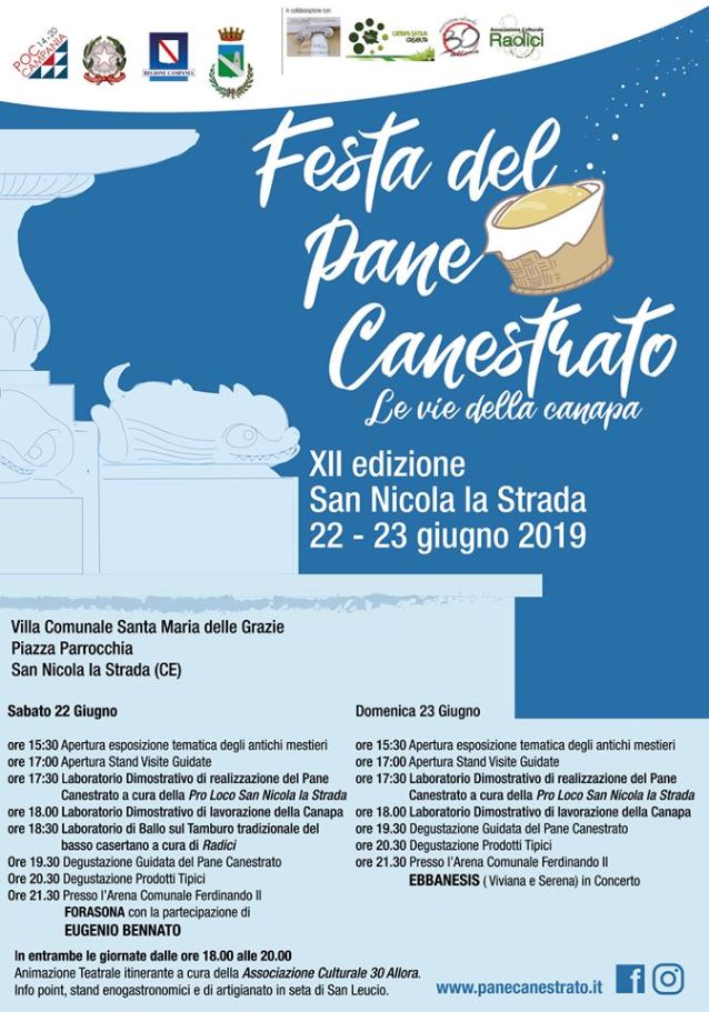 L’evento è stato realizzato con il contributo della Regione Campania, attraverso il Programma Operativo Complementare (POC) Campania 2014-2020 eventi per la promozione turistica e la valorizzazione culturale dei territori, Comune di San Nicola la Strada, ed in collaborazione della Pro Loco di è Presidente Carlo D’ANDREA, CANAPA SATIVA CASERTA, 20 ALLORA e l’ASSOCIAZIONE CULTURALE RADICI. Programma giugno 2018-giugno 2019. Di seguito il calendario del programma: